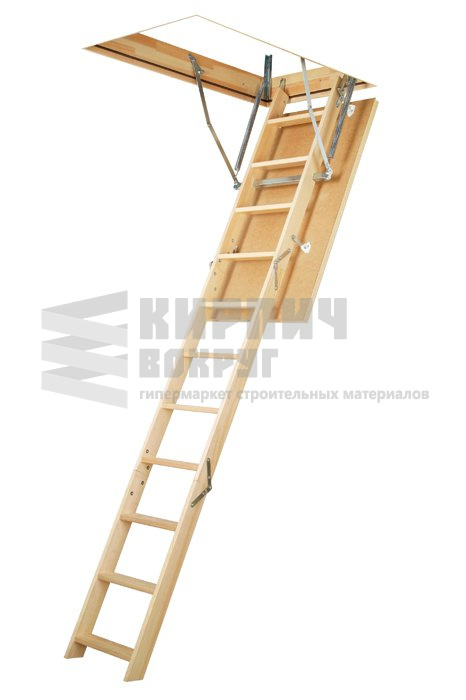 Чердачная лестница LWS Plus изготовлена из сосны, укомплектована утепленной крышкой люка (толщина крышки с утеплителем – 36 мм), облицованной ДВП древесного цвета.
